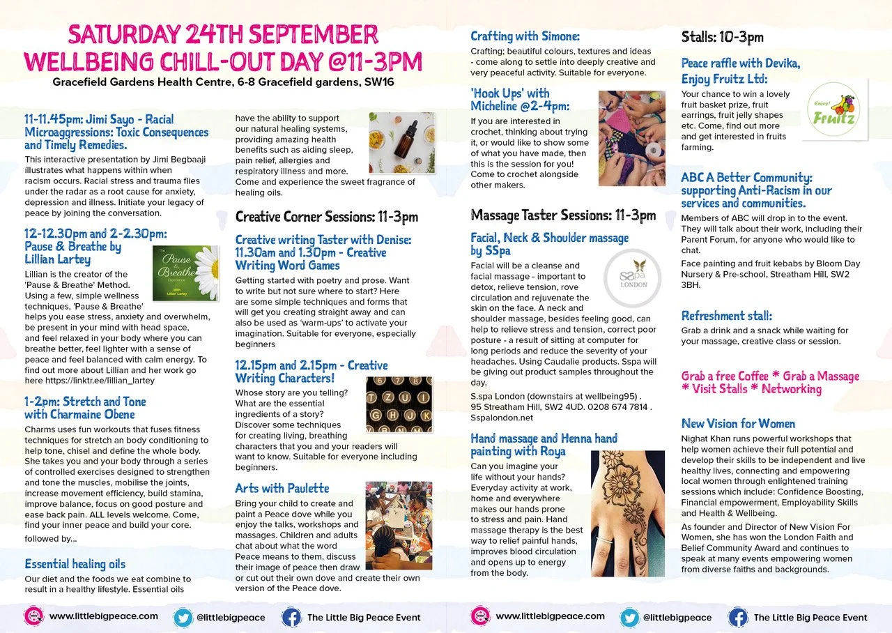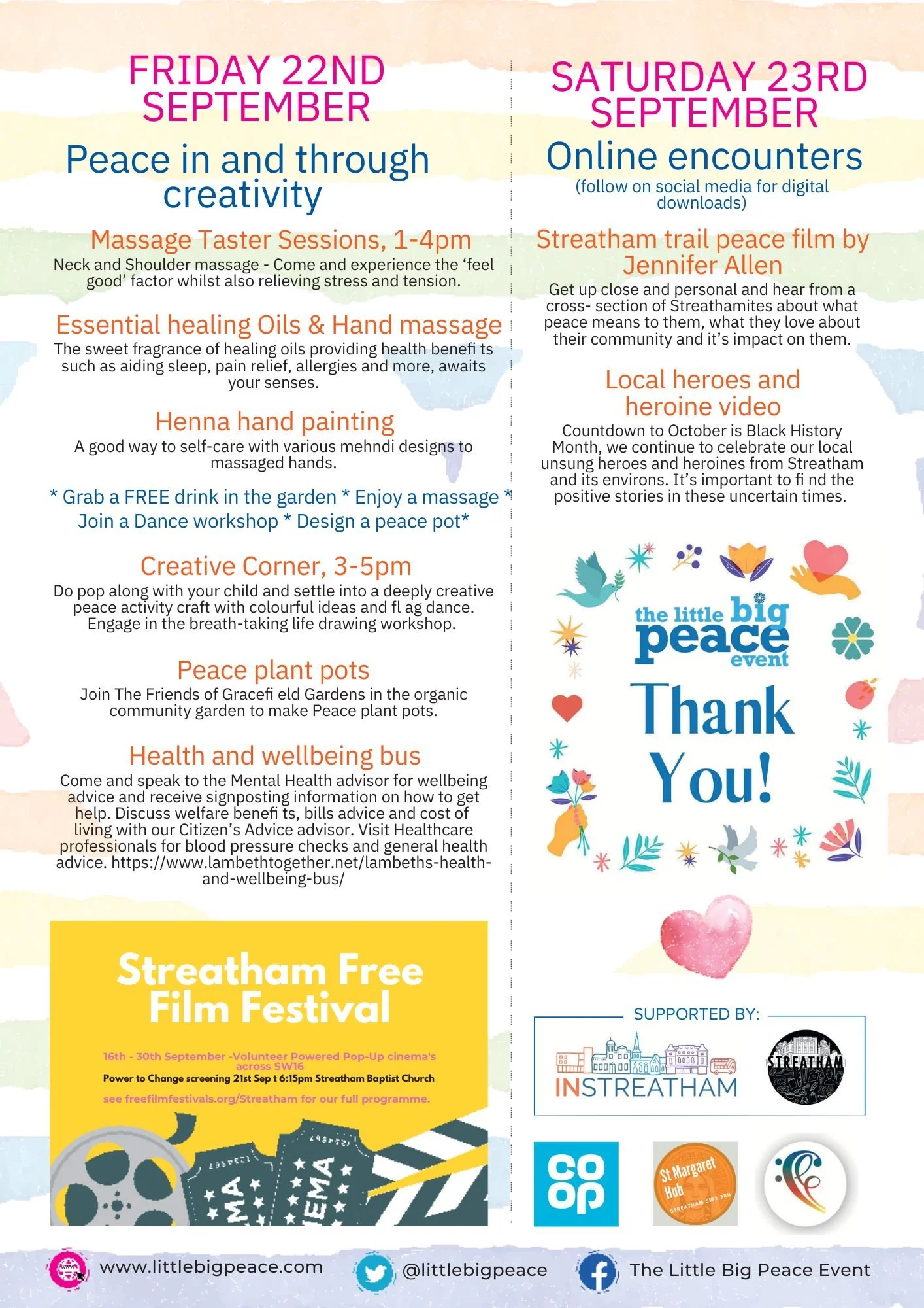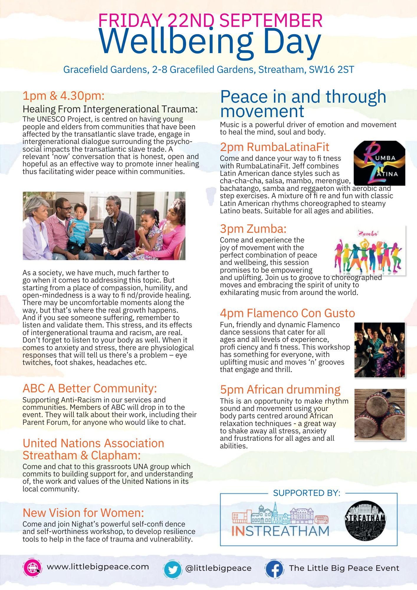 In 2022 we celebrated the Little Big Peace Event at Gracefield Gardens, in the heart of Streatham with a Well-being and chill-out day on Saturday 24th September.